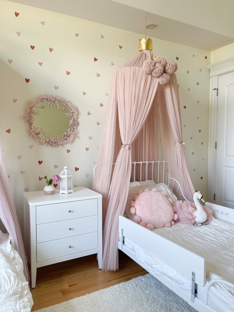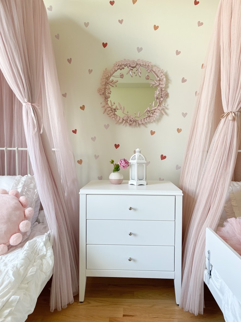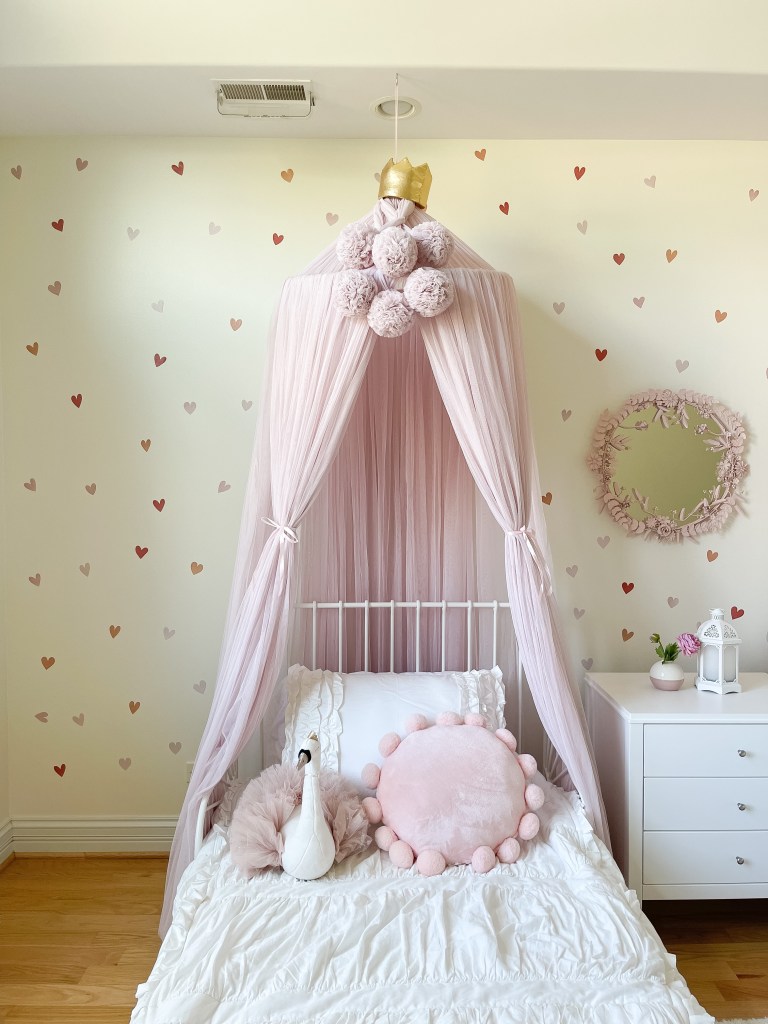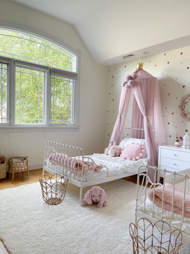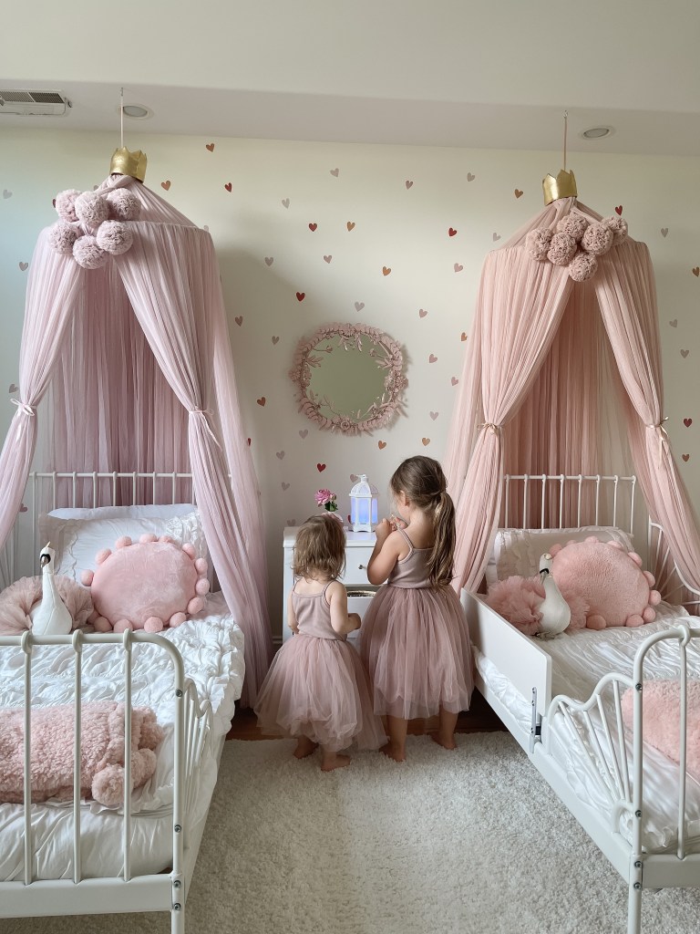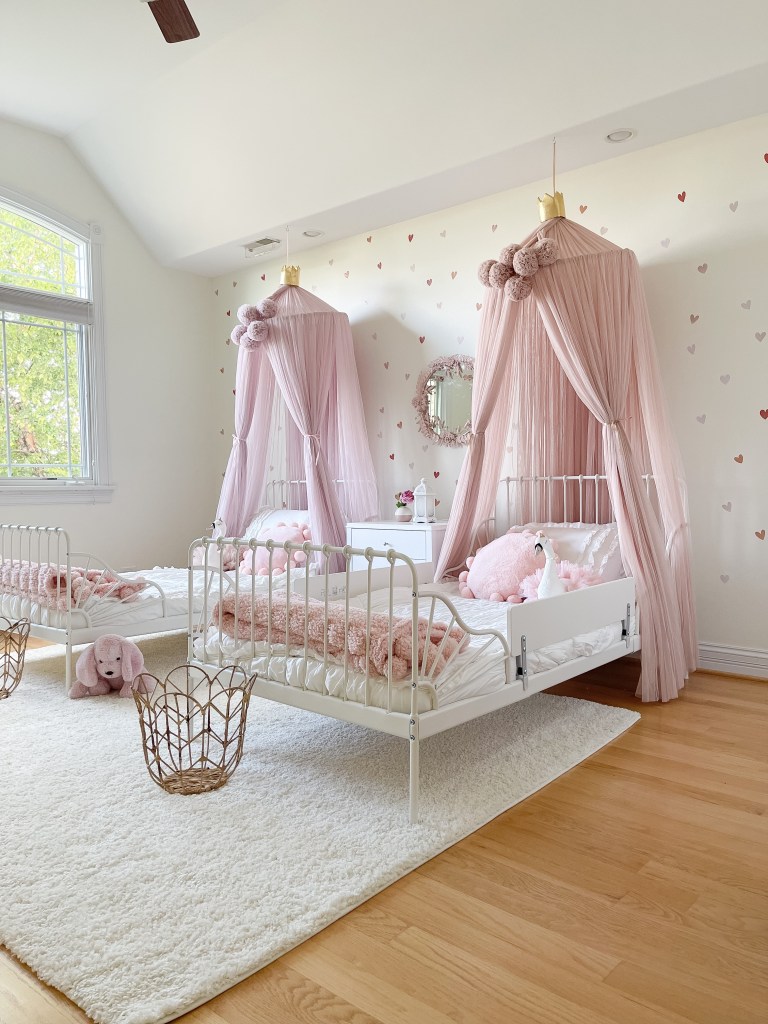 Anastasija, my three and a half year old loves pink and she wanted the room to be as pink as possible. We opted out of pink wall paint and instead did pink accents like the canopies, mirror, pillows, hearts, etc. She was in love with it all. Aleksandra, our sixteen month old was just happy about it all.