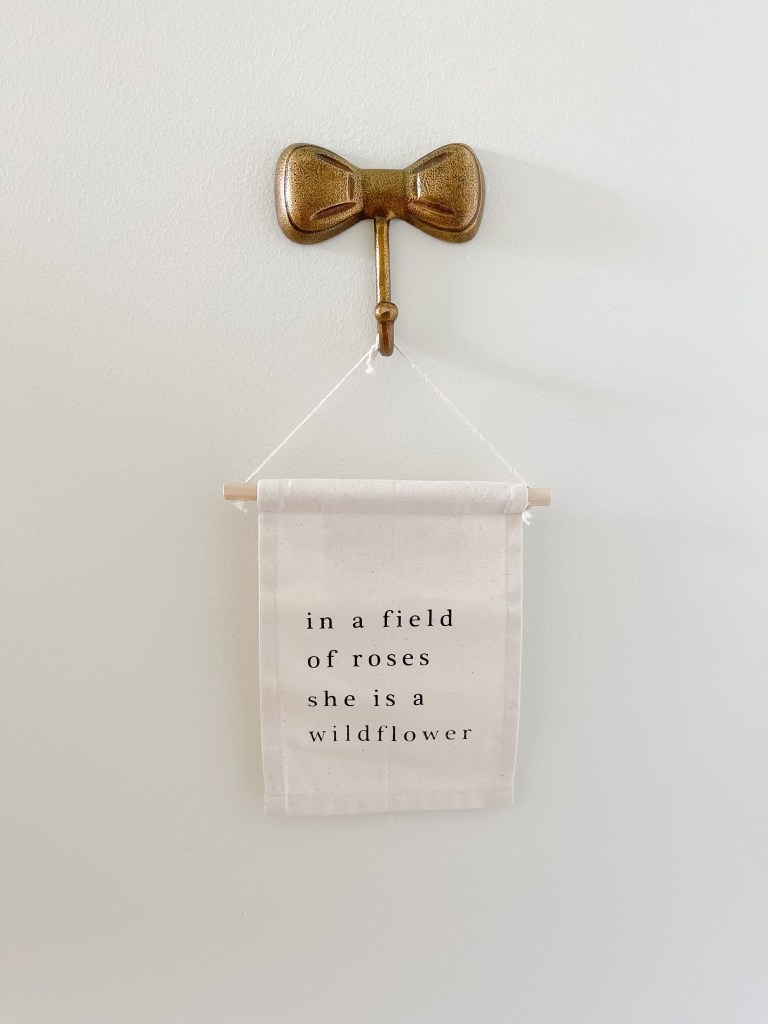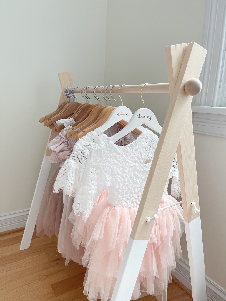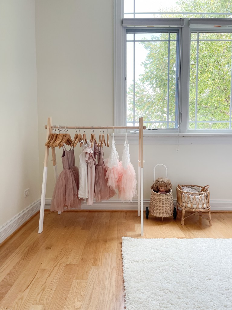 I had envisioned a dress rack for the girls and this was perfect — handmade from wood from a small shop on Etsy.