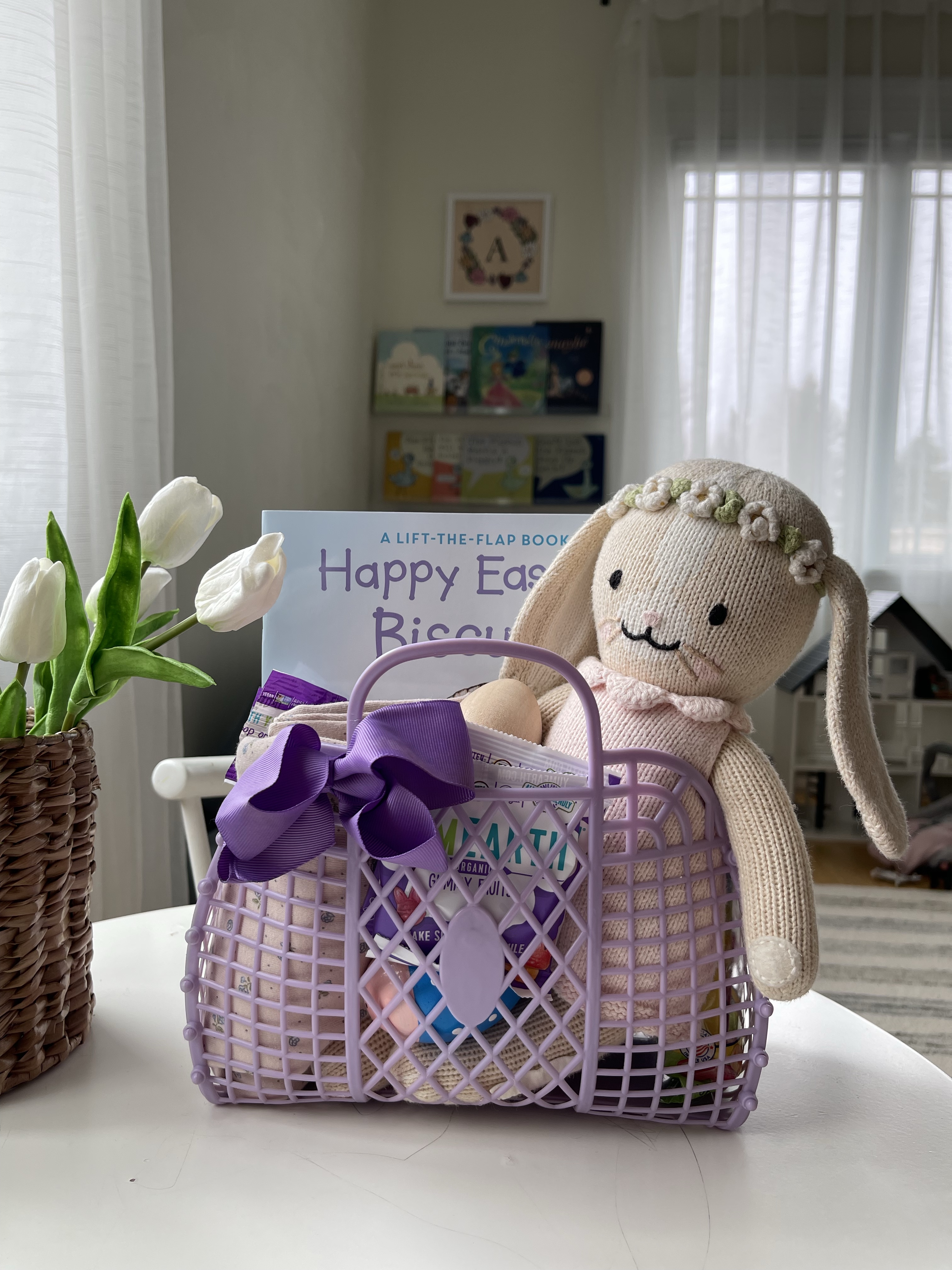 Basket filler: jelly bean bag, hair bow, Cuddle and Kind doll, book, Yum Earth lollipop & fruit snack, Easter egg, Dot It activity, and spring pajama.