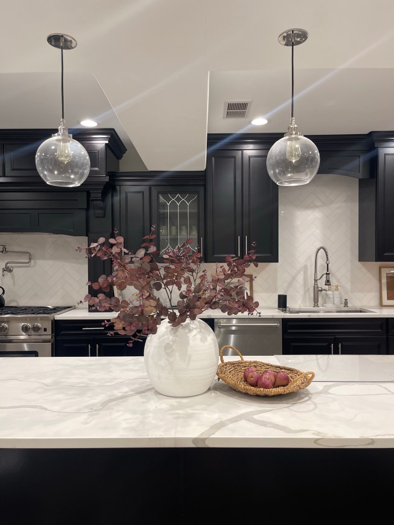 Here is our kitchen in the basement. It’s such a beautiful all black cabinet kitchen with stainless steel appliances. It was well thought out and beautifully designed. I have yet to find the perfect counter stools for our island.