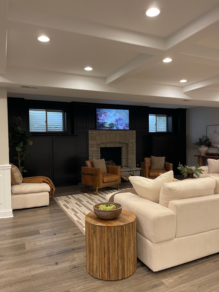 This is our cozy movie area with a fireplace. We have black built-ins around the fireplace and they are amazing for storage. When designing this space I wanted to keep it neutral and also warm using beige, brown and adding some contrast with leather chairs. These chairs are such great quality and so beautiful. I partnered with Edloe Finch and they gifted me the chairs.